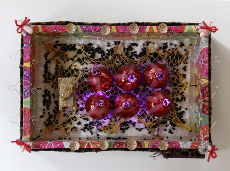 Kritisches Diorama mit güldenen Soldaten, Panzer und beleuchteten Weihnachtskugeln. Holzkiste, Plüsch, Zwiebelnetz, Linsen, Zahnbürste, Puppenbeine, Spielzeug, Lichterkette. 30 x 20 x 5 cm