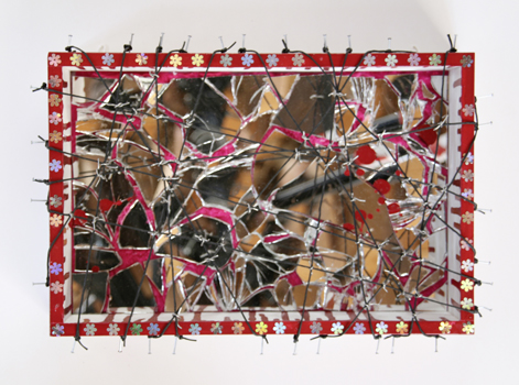 Splitterlich irritierend: das Spiegeldiorama. Holzkiste, Spiegel, Plüsch, Bindfaden, Nägel. 30 x 20 x 5 cm