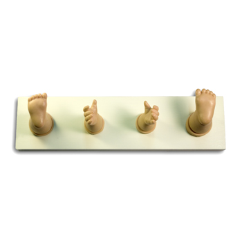 Weiße Hakenleiste mit je zwei dicken kurzen Armen und Beinen. 8 x 30 x 7 cm